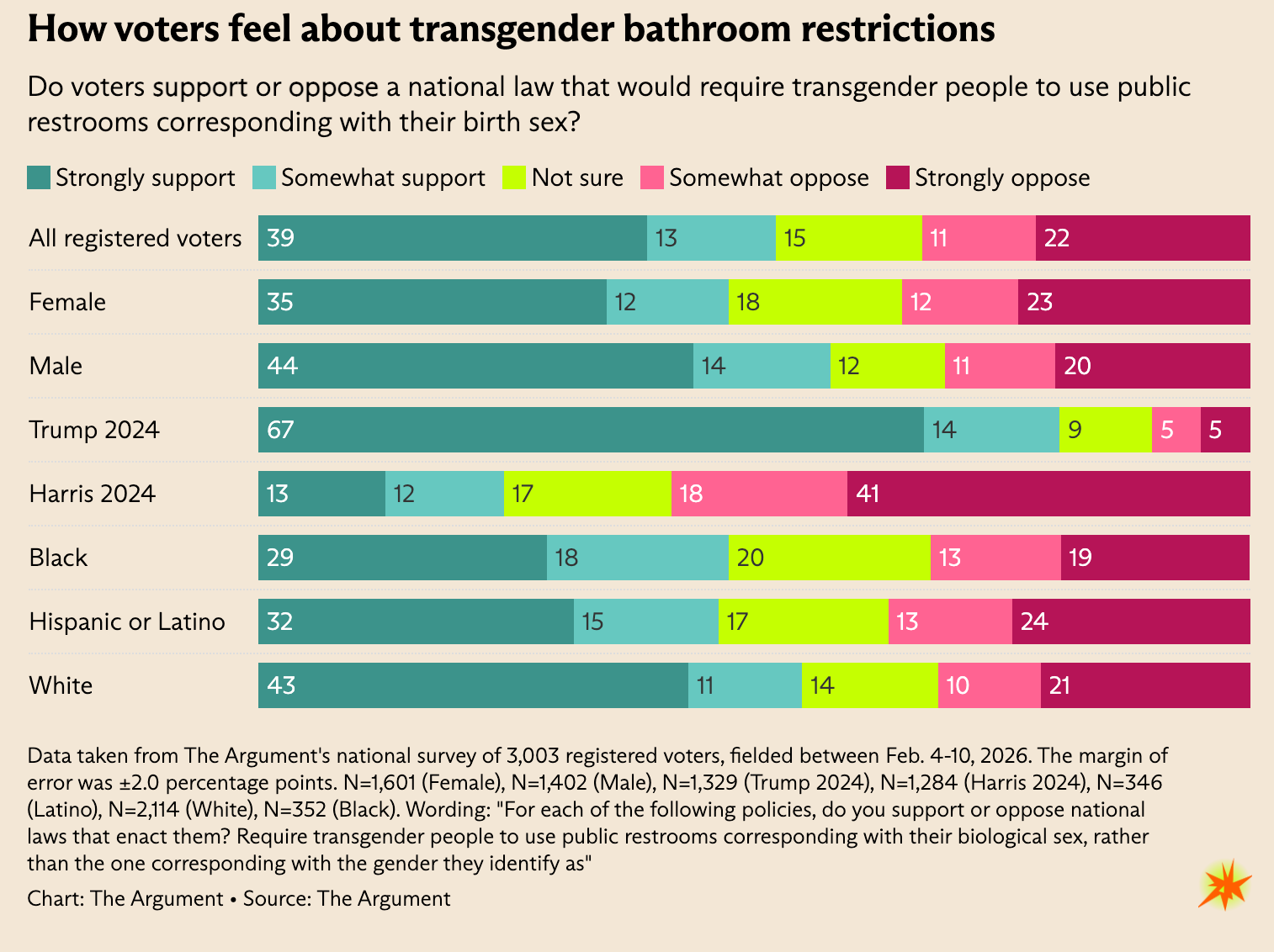 According to a US survey presented and analyzed by Lakshya Jain in The Argument, measures once widely opposed, such as bills requiring transgender people to use bathrooms corresponding to their sex assigned at birth, now has the support of a majority of voters, with about 52 % backing such legislation and only 33 % opposing it.